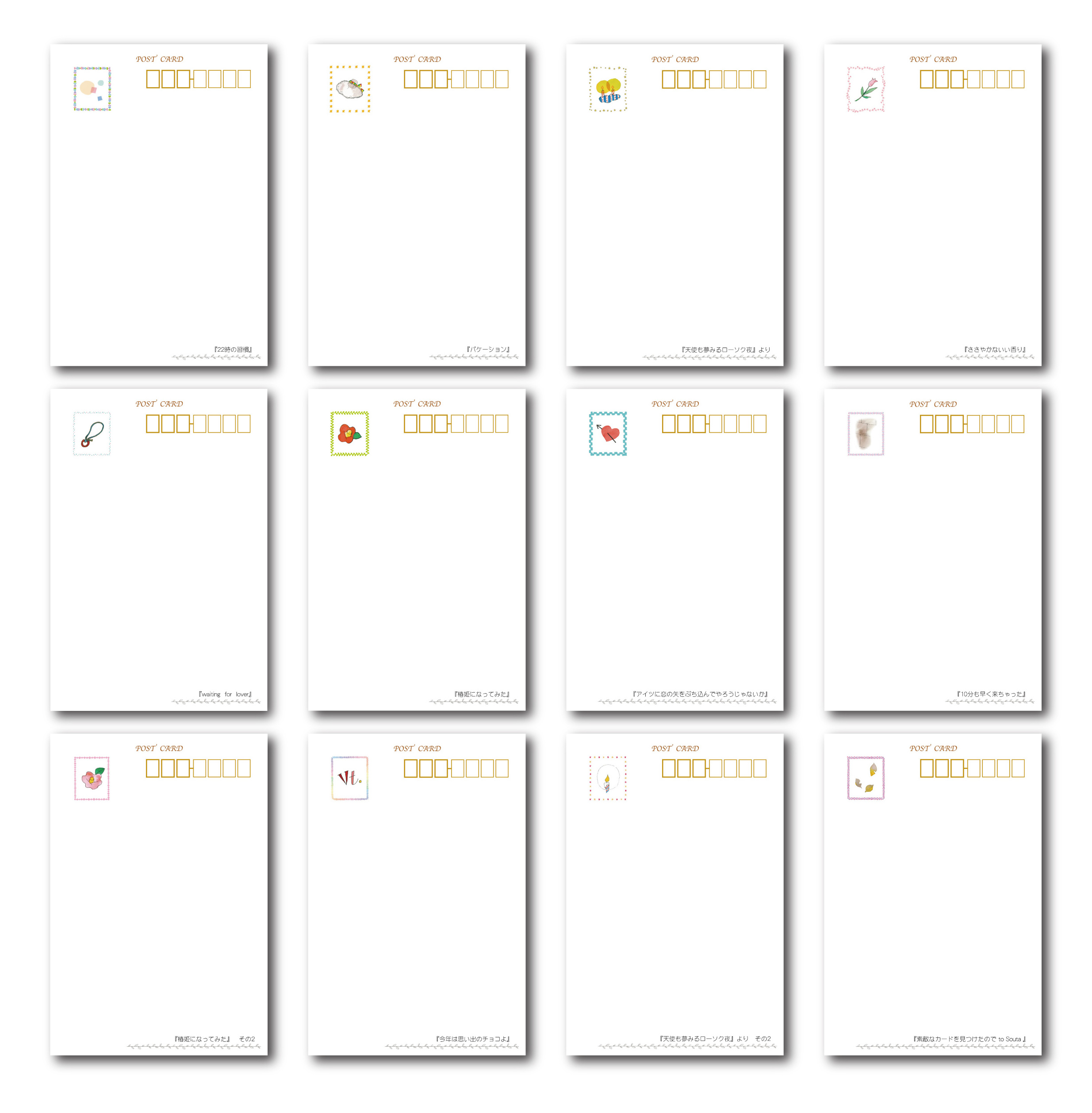 それぞれおもて面には右下に作品のタイトルと、切手を貼るスペースにはかわいいモチーフが描かれています。